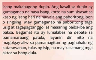 Mga Tauhan sa Balagtasan Piskal o Tagausig Akusado at Abogado - ito ay magiging debate o sinasabing tagisan ng katuwiran sa panig ng taga usig at tagapagtanggol at. Balagtasan ay isang makabagong DUPLO Ang mga kasali sa duplo ay gumaganap na nasa isang korte na sumisiyasat sa kaso ng isang hari na nawawala ang paboritong ibon o singsing. Para sa kategoryang pang-elementarya A ang piyesa sa Balagtasan ay maaaring hindi orihinal ngunit ito ay dapat na nallmbag na sa anumang aklat o babasahin.