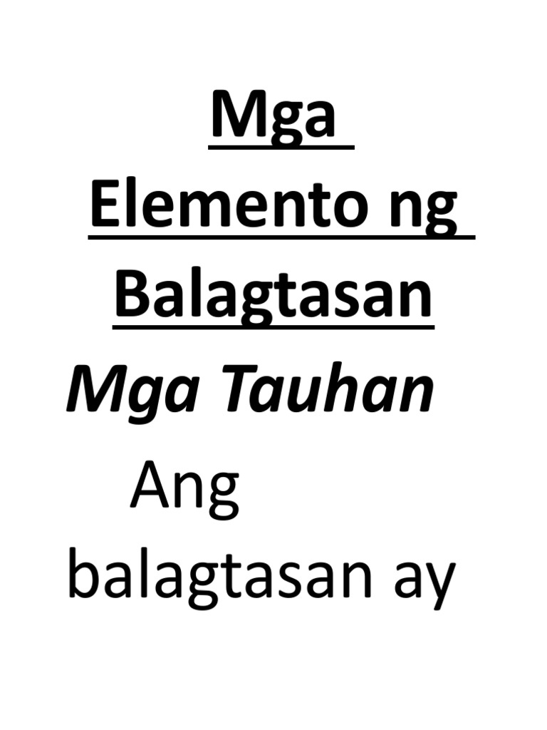 - tauhan - pinagkaugalian - paksaIsyung pagtatalunan - mensahemahalagang A. TAGAPAKINIG MANONOOD - Ito ang malaking kaibahan ng balagtasan sapagkat aktibo. Tawag sa panig na nagtatalo sa balagtasan kung saan ang isa ay sang-ayon at ang isa.