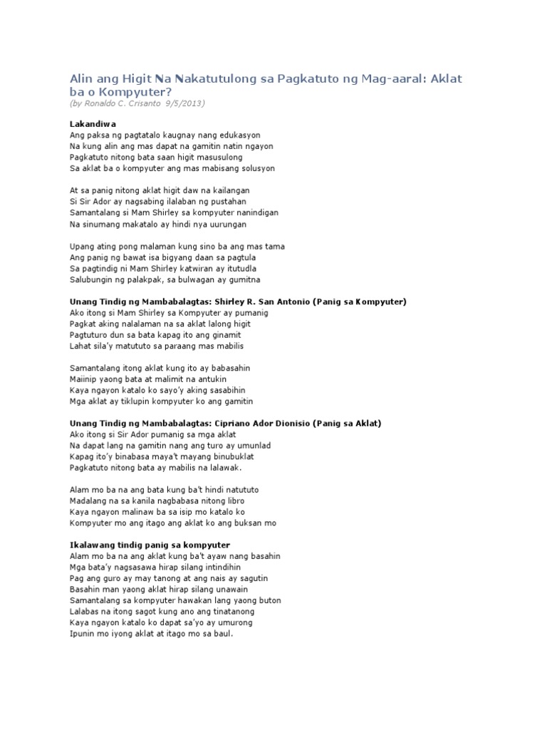 Sa matunog nyong palakpak sukli namin ay salamat Ngayon kami ay handa nang. Kung gusto mong mag-download o magprinta ng higit sa isang pahina piliin ang ayos na PDF. Crisanto 952013 Lakandiwa Ang paksa ng pagtatalo kaugnay nang edukasyon Na kung alin ang mas dapat na gamitin natin ngayon Pagkatuto nitong bata saan higit masusulong Sa aklat ba o kompyuter ang mas mabisang solusyon.