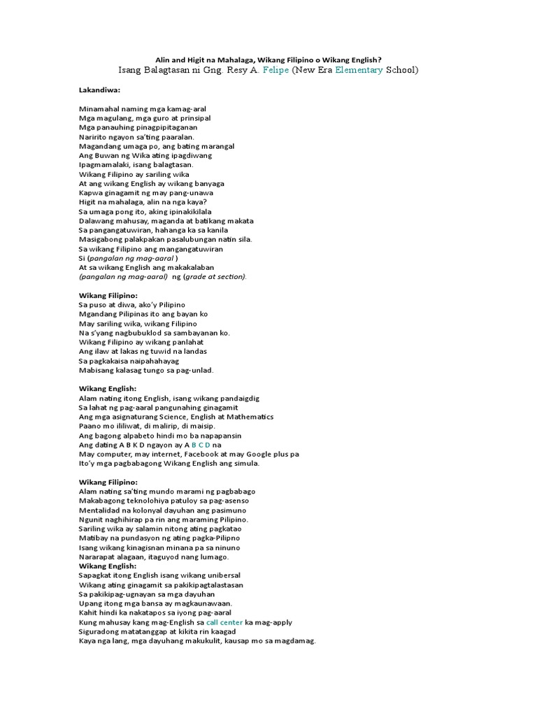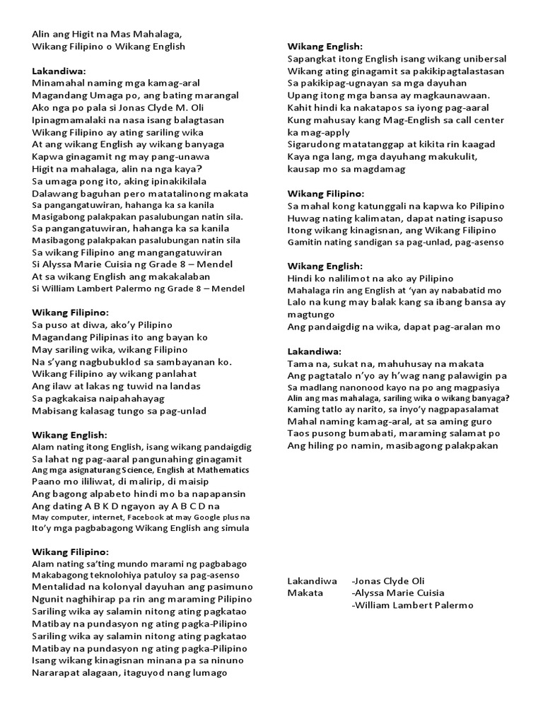 Alin and Higit na Mahalaga Wikang Filipino o Wikang English.