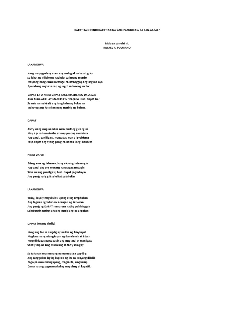 Krus na Ligas High SchoolGuro. Short poetic about the heart or mind. Balagtasan scriptdocx - Nasa KABATAAN ba o nasa MAY GULANG ang pag-asa ng bayan LAKANDIWAPagbubukas Nais po naming maghandog sa inyo ng balagtasan.