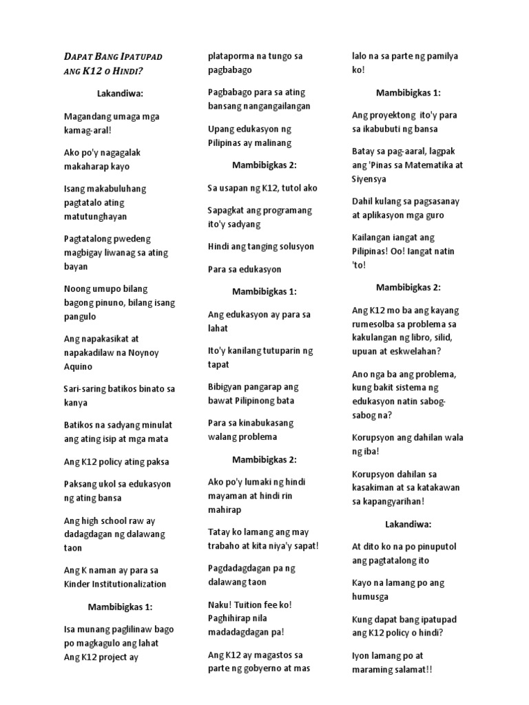 Ako po ang inyong punong lakandiwa Magpapakilala ng dalawang manunula Isang magsasabing yaman ang mas sasagana At isang nagsasabing talino ang mas mahalaga Ano nga ba ang totoo mga binubinit ginoo Anong mas mahalaga Yaman ba o talino Kanilang pagtatalunan ang paksang binanggit ko Masigabog palakpakan. Ang may pera ang siyang laging pinapanigan 1. Lahat ay posible bastat nagagawa.