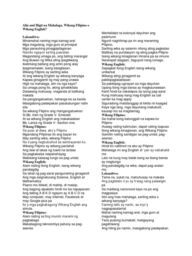 2 question Alin ang mahalaga wikang filipino o wikang english. View balagtasan wikang filipino o wikang englishdocx from agricultur agex 101 at misamis oriental state college of agriculture and technology. Ayon kay Rom Peña Ang sariling wika ay hindi nakababawas ng katalinuhan at katanyagan kung gagamitin sa ibat ibang larangan.