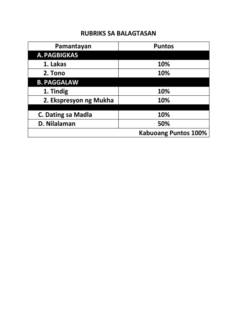 Contextual translation of criteria ng balagtasan into Tagalog. 24-JUNE-2020 RUBRIKS Pamantayan sa pagbibigay ng puntos sa pagsulat ng komposisyon talata at sanaysay.
