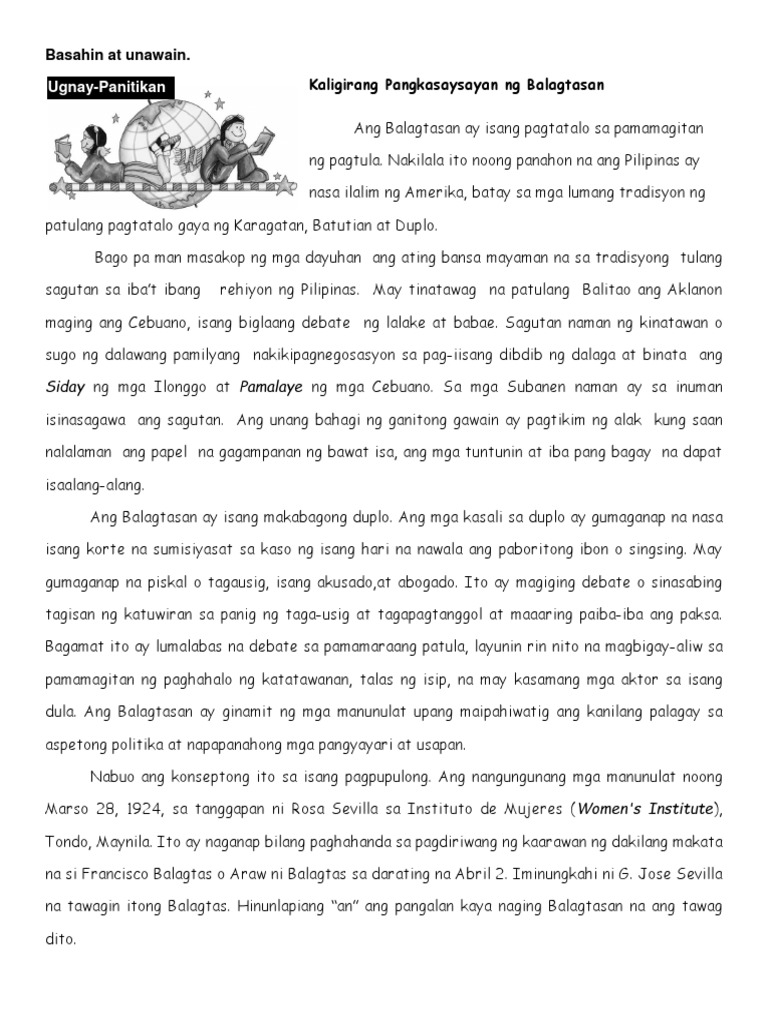 Ibigay ang hinihingi sa bawa bilang. Kaligirang pangkasaysayan ng balagtasan means literate historic poetry. Petsa ng unang pagpupulong para sa paghahanda sa kaarawan ni Balagtas.