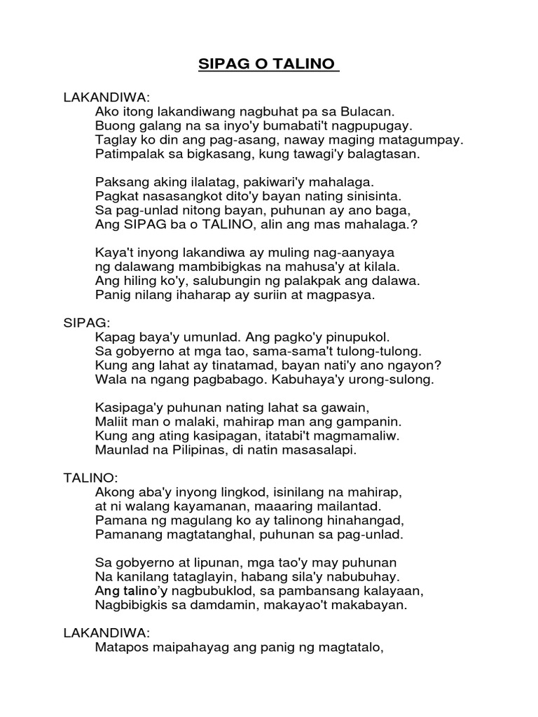 Ang tingin ko sa kanyang katalo ay isang praktikal. Contextual translation of balagtasan about kayaanan o karunungan into Tagalog. Joel Torres LAKANDIWA Balagtasan Balagtas ang ngalay nagmula Debateng patula tulang mahabang-mahaba Kung baoy may kahinaan ditoy di uubra Pagkat itoy tagisan ng talino sa matwid ay hasa.