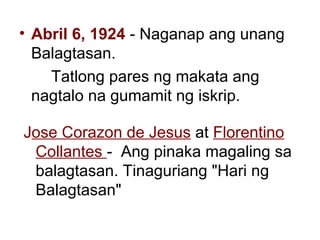 Mga tanong sa Tagalog. Ang balagtasan ay uri ng pagtatalo ng dalawang magkaibang panig ukol sa isang paksa. Francisco Balagtas the inspiration for the creation of balagtasan.