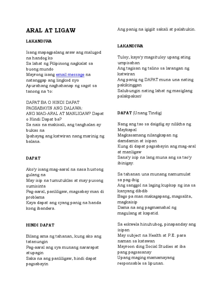 LAKANDIWA HINDI DAPAT Unang Tindig Isang mapagpalang araw ang malugod na handog ko Sinasabing mas madali sa tao ang maging henyo Sa lahat ng Pilipinong nagkalat sa buong. Dapat ba o hindi dapat pagsabayin ang panliligaw sa pag-aaral Search Results VIDEOS GALLERIES Show All Videos Channels. Ni Pat VillafuerteTaken on August 23 2012 at the Buwan ng Wika activity of Unida Christian Colleges in Imus Cavite.