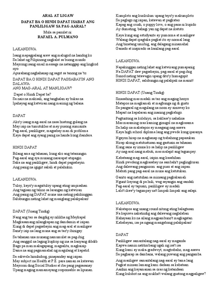 Pag-aaral panliligaw magsabay man di problema Kaya dapat ang syang panig na handa kong ibandera. View FILIPINO-BALAGTASANdocx from AA 1DAPAT O DI DAPAT ISABAY ANG PAKIKIPAGRELASYON SA PAG AARAL. Dahil rin dito tayoy nalikha ng Dyos.