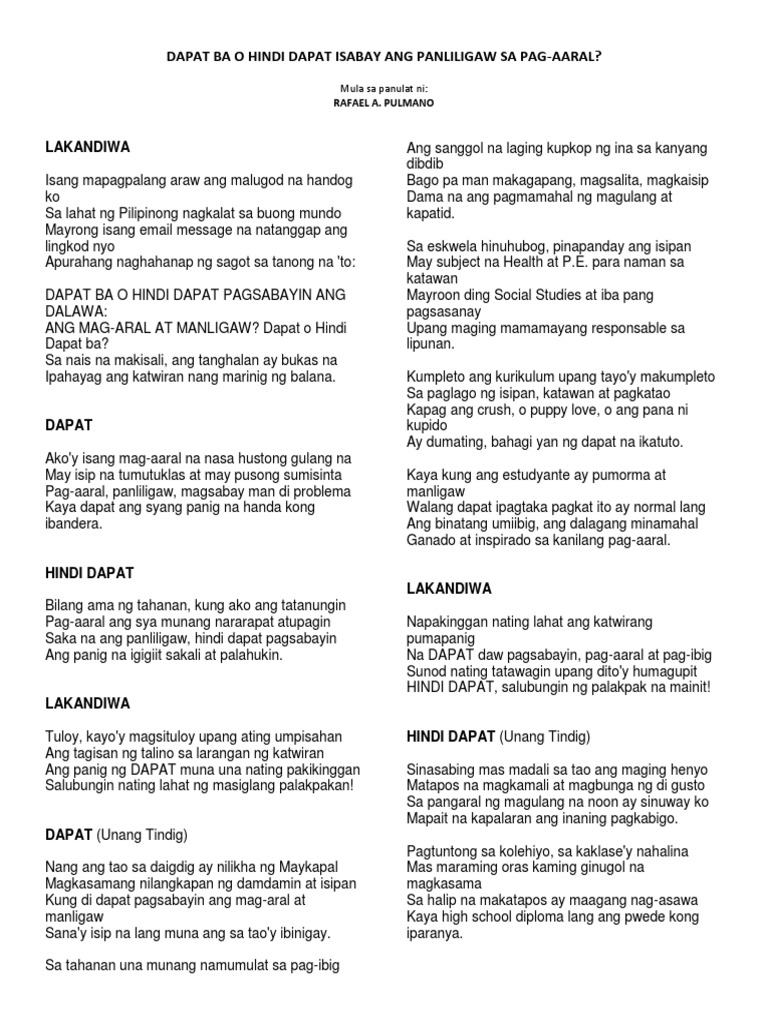 DAPAT Akoy isang mag-aaral na nasa hustong gulang na May isip na tumutuklas at may pusong sumisinta Pag-aaral panliligaw magsabay man di problema Kaya dapat ang syang panig na handa kong ibandera. Balagtasan sa Notre Dame Academy San Fernando Cebu. Pooyaah Stylaaah Oy was just soliciting opinions some of her former students on how they can handle the situation for having boyfriendgirlfriend while they.