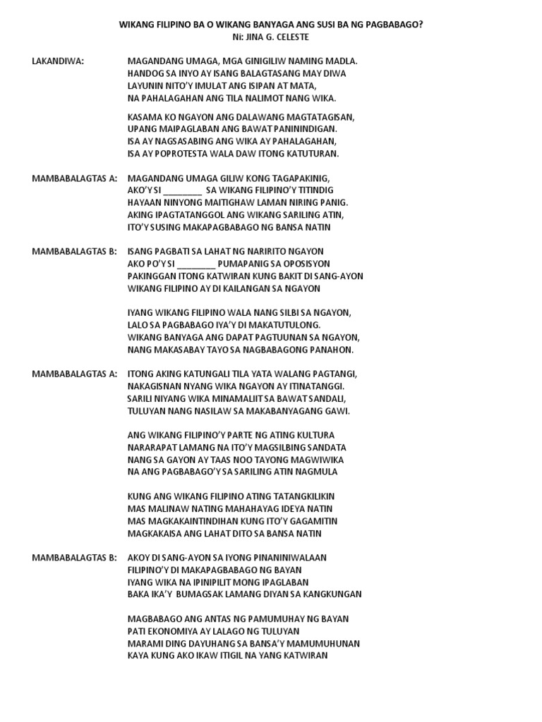 Ipinagmalaki niya na ang mga kaugaliang kagaya ng Balagtasan at pagbigkas ng mga awitin at tulang Filipino ay dapat na palawigin ng ating mga kababayan upang higit itong makilala sa. Frequently Asked Questions FAQ News. Wikang filipino ba o wikang banyaga ang susi ba ng pagbabago.