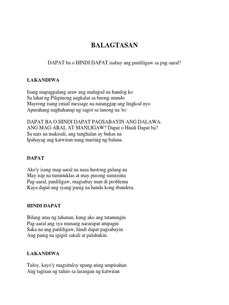 2017-01-29 Read Pag-ibig o Pera Balagtasan from the story Strange Pieces by eTheLaNdia aMor_pRimo with 4945 reads. - httpbitlyiWantYouTube Follow us o. Nandito tayo upang alamin Pakinggan natin ang saloobin Ng mga makata sa ating usapin Ako po ang inyong punong lakandiwa Ating kilalanin ang dalawang makata Isang nagsasabing pag-aaral ang dapat mauna At isang nagsasabing pag-ibig ang mas mahalaga.