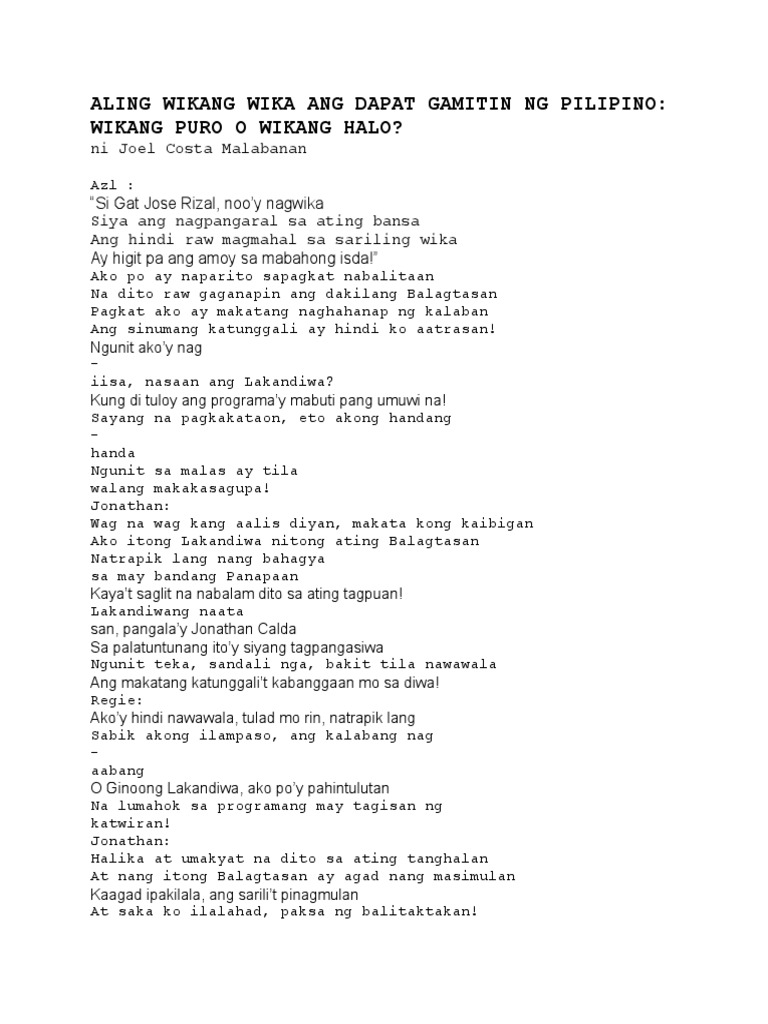 Balagtasan piece wikang puro wikang halo script. Magandang umaga po ang bating marangal Ang Buwan ng. GROUP 7 Alin and Higit na Mahalaga Wikang Filipino o Wikang English. Nararapat lamang na puro ang kanilang makita at marinig.